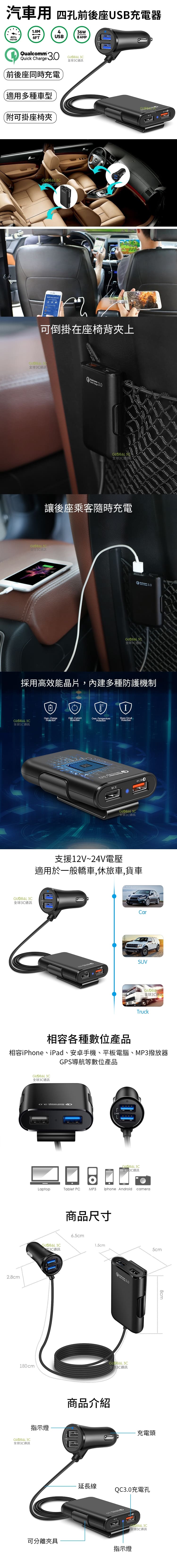 商品名稱:前後座QC3.0四孔USB 8A車充
