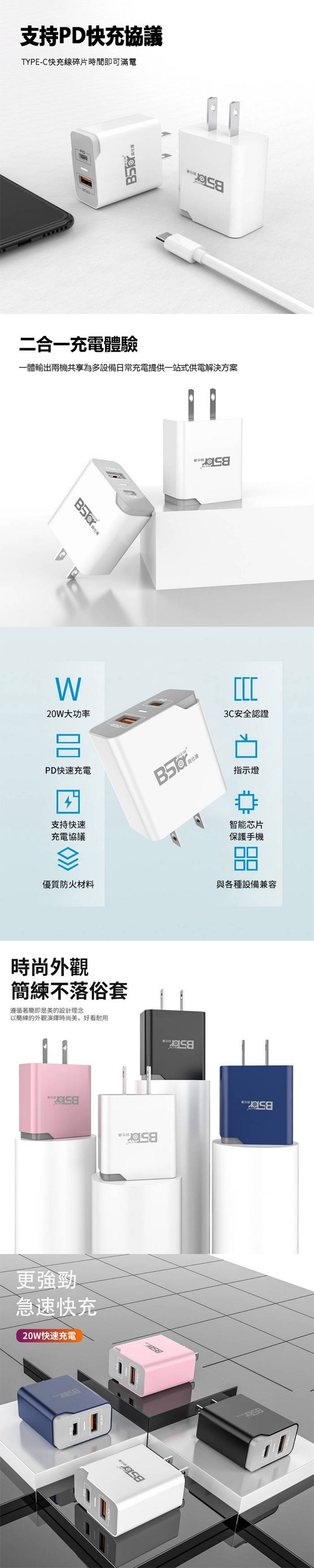 BSTar貝仕達 20W 雙孔 PD+QC3.0雙協議Type-C USB雙孔快充頭AD-03 豆腐頭 充電器 充電頭