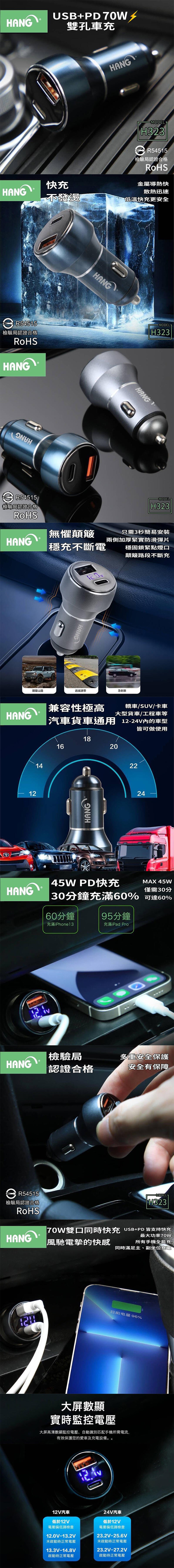 HANG 車充 70W 12V 車充頭 車用旅充頭 雙孔快充 PD USB 汽車電瓶檢測 H323 車載快充 點煙器
