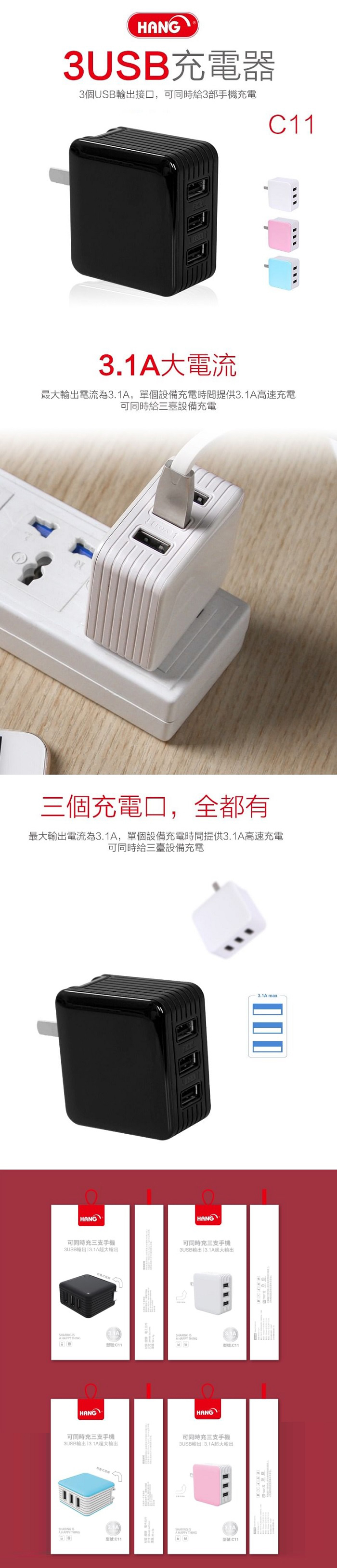 HANG C11 三孔USB充電器 3.1A快充 充電頭 豆腐頭