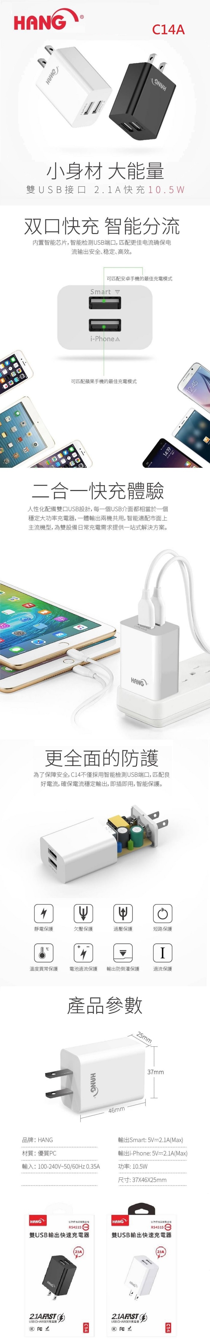 2.1A 充電器 快充頭 雙USB 雙輸出 豆腐頭 旅充 充電頭 HANG C14