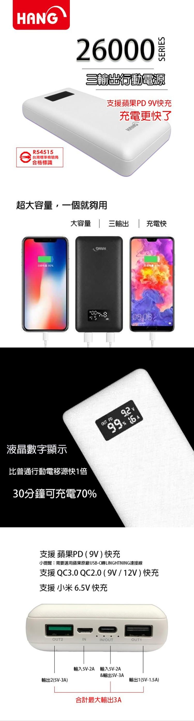 HANG P2 26000mAh PD快充液晶顯示電源 9V12V QC3.0 快充 行動電源 移動電源