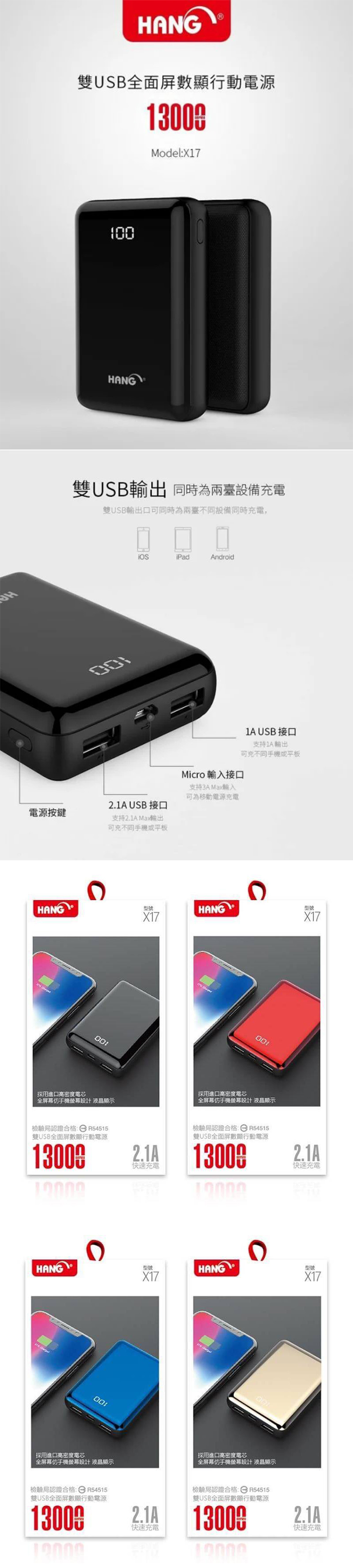 HANG X17 13000mah 液晶顯示 電鍍迷你行動電源 雙USB輸出 充電器 旅充快速充電