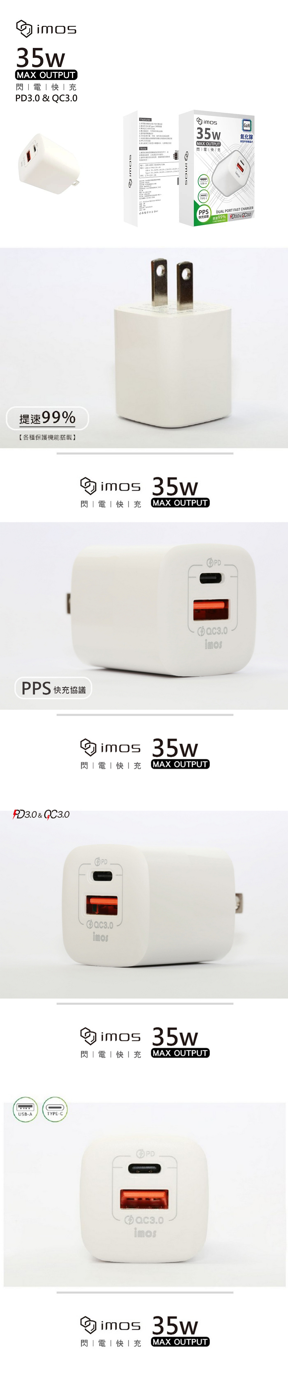 imos PD3.0/QC3.0 35W雙孔閃電充電器 GaN氮化鎵 充電頭 豆腐頭 快速充電 TypeC USB